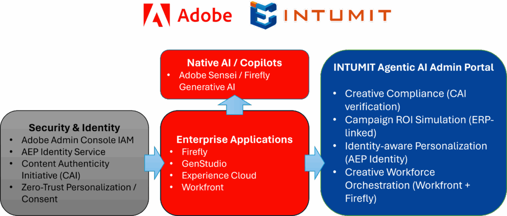 ADOBE + INTUMIT:Experience Cloud と Firefly を活用 エンタープライズ対応のクリエイティブマーケティング Adobe x INTUMIT によるクリエイティブの加速 INTUMIT と Adobe は連携し、クリエイティブワークフローとデジタル体験を提供します。Adobe Firefly、Creative Cloud、Experience Manager と連携することで、INTUMIT の Agentic AI 管理ポータルはコンテンツパイプラインを自動化し、大規模なパーソナライズ体験を実現します。本パートナーシップにより、マーケティングおよびクリエイティブチームは、Adobe 上で高品質かつ一貫性のあるエンタープライズ AI およびインダストリアル AI サービスを実現できます。 データを活用したキャンペーン運用 GenStudio のキャンペーンを SAP や Oracle などの ERP システムと接続し、そのデータをナレッジベースとして活用することで、業務効率とパフォーマンスを最適化します。 パーソナライズされた Agent/Agent Ready 代替ソリューション AI 駆動の Agent が Experience Cloud と連携し、ブランドライブラリや規制ルールを考慮しながら、Firefly の出力をリアルタイムで監視し、Experience Cloud の信頼性と安全性を維持します。 Firefly 出力を活用した Workfront タスク ID 管理とゼロトラストの保証 Agentic AI 管理ポータルのプロンプトエンジニアリングツールを通じて、プロジェクトのタイムラインを自動生成し、必要なリソースを最適な形で計画・提案します。 Adobe Experience Platform Identity Service、Adobe Identity、Adobe Content Authenticity Initiatives(CAI)と連携し、認証されたユーザーのみがクリエイティブ資産を利用できるようにします。 カスタマイズ可能な AI Copilot/AI Agent ソリューション(Agentic AI) RAG と推論プロセスを組み込んだプロンプトを作成・埋め込み、個人データとプライバシーを安全に保護します。 多様な生成 AI ソリューション セマンティック検索、音声インタラクション、多言語対応、自動ドキュメント生成など、用途に応じた AI ソリューション。 オムニチャネル拡張とサポート Teams、Slack、LINE、FB Messenger、Zalo、WhatsApp、IVR、音声ボット、アバターなどに対応。 詳細についてはお問い合わせください。 ADOBE x INTUMIT