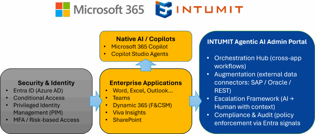 INTUMIT は Microsoft 365 にインテリジェントオートメーションを提供します。ユーザーはコンテンツ作成、会議要約、ワークフローの簡素化を行い、Teams、Outlook、SharePoint、OneDrive と連携したシナジーある顧客体験を実現できます。手動作業を削減し、協働を加速することで、企業の生産性を向上。INTUMIT は Outlook 上でポリシー準拠のメール下書きを生成し、Teams 会議を具体的な参照付きで要約し、SharePoint ドキュメントから構造化されたプロジェクト計画を作成することで、エンタープライズ AI およびインダストリアル AI の取り組みに付加価値を提供します。